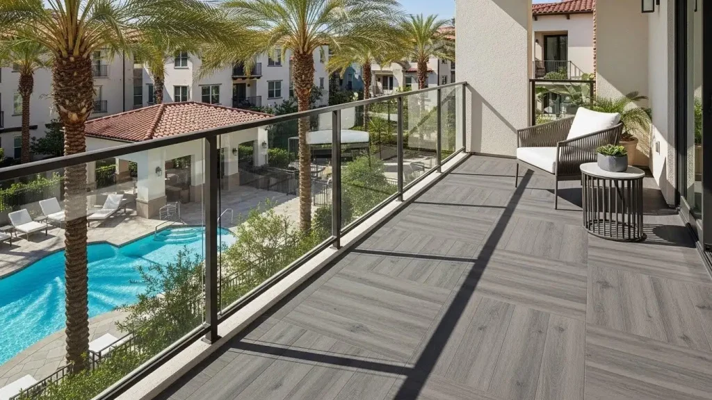 Balconies have become real living spaces. Residents want them to feel like an extension of the living room, not a rough leftover area. Hotels and mixed-use buildings also want finishes that install quickly, reduce noise to neighbors below, and are easy to refresh between tenants or renovation cycles.